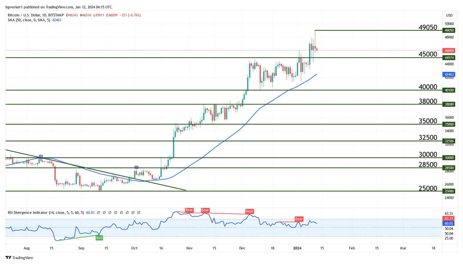 Bitcoin ETFs and their approval made the headlines for several months but now that the story has reached its conclusion, Bitcoin seems uncertain of the next move. The recent events pushed BTC/USD to a high of $49,050 but the last few Daily candles show clear signs of indecision and even exhaustion.