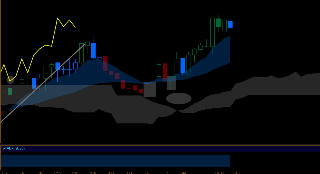 There is a problem though, the valley in the Kumo illustrated by the oval to the right of the entry. Price will often hug the Kumo and test it’s bounds before it moves on & that makes the valley a risk. The next highlighted green candle is the perfect entry – the chikou has cleared tested & rejected the Kumo, the EMA cloud remained positive throughout and the candle itself is a nice green hammer right in the EMA cloud.