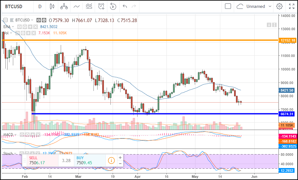 Bitcoin fell hard on the news, extending losses begun earlier in the week. The good news is that the token has stopped at a support target and looks like it might hold at this level. Also good news, BTC is trading at such a low price that many miners are not able to show a profit. This means they will be holding their tokens, reducing available supply and aiding a build up in demand that will fuel the next rally. If price falls to the $7,000 I am a buyer.