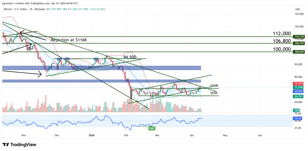 Bitcoin climbed as high as $72,865 on Wednesday after the news regarding the truce and Iran’s fee on oil barrels, but pared gains on Thursday’s trading session. However, there’s a technical side to the move as well: the climb touched a long-term bearish trend line, and the price immediately moved lower.