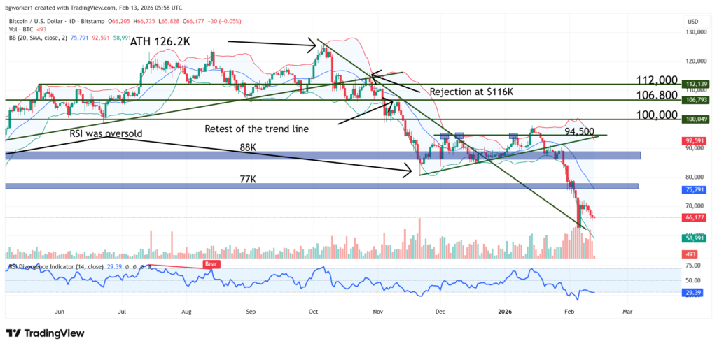 Bitcoin is currently changing hands at $66,200, after failing to recover significantly from below $60K lows. The price was rejected by the bearish trend line that we talked about previously, but the move lacked conviction and died out quickly.