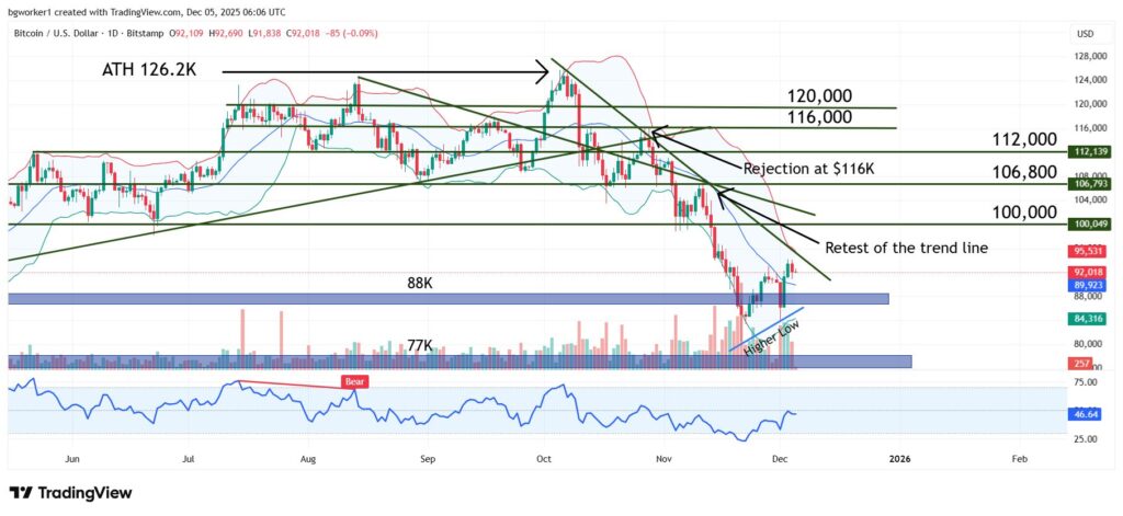 The main thing to watch for clues about a full-scale reversal is the bearish trend line drawn from the All-Time High. If the bulls manage to break it and close a daily candle above it, we are looking at increased chances of a move above $100K.