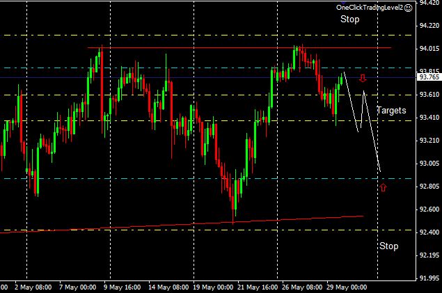 I also have an order to buy down below at 92.88. This is based on the rising lows of the triangle type pattern we are in.