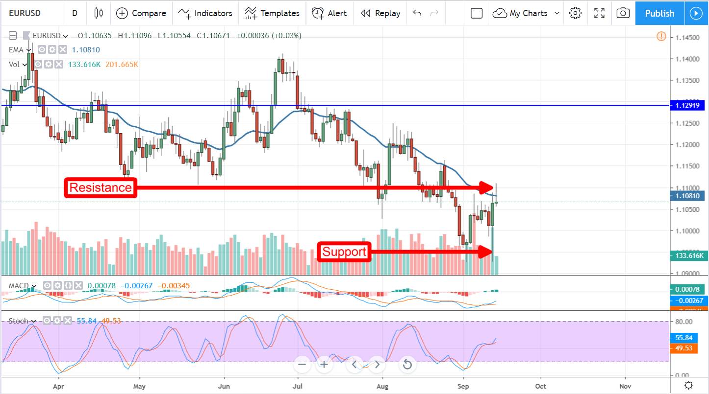 Now it looks like the EUR/USD is in a reversal. I mean, it just created a double-bottom at a key support level and there are other bullish indications as well. Both MACD and stochastic are both showing entry signals, the caveat is twofold. First, the pair is showing resistance at the short-term moving average and the overall trend is down. Second, the resistance is also consistent with a previous low which makes the chance of bullish break out even less. Third and most important, the FOMC is meeting next week. They FOMC is expected to cut rates with a virtual 100% certainty and the outlook for future cuts is aggressive. The risk is in the data. Data including today’s Retail Sales does not support the idea of U.S. economic weakness so the FOMC is not likely to meet the market’s expectations.