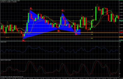 We have four pairs of letters. X-A , A-B, B-C and last C-D. The leg A-B should be a 61.8 fibonacci retracement of the leg X-A. B-C should be a 38.2 or 88.6 fib retracement of the leg A-B and finally the leg C-D should be a 78.6 fib retracement of the leg X-A. If you have these retracements the Gartley Pattern is ready. We should expect a reversal in the letter D and maybe the beginning of a new trend. In our case 78.6 fib retracement is a past support(you can’t see it in the screenshot but you should always look for past price levels), our RSI is oversold and we have a crossover in the stochastic oscillator near level 20.