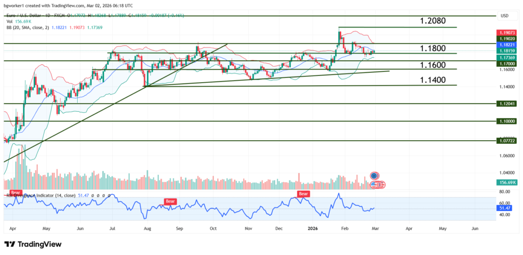 The pair is still hovering around 1.1800, struggling to gain a sense of clear direction. After the top at 1.2080, the dollar bulls have been mostly in control, but momentum has diminished lately. The U.S.–Iran conflict will likely affect price action going forward.