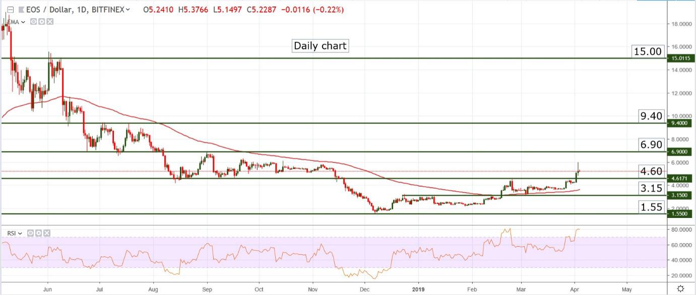 Currently EOS is valued at 5.25 US Dollars and is ranked 6th on CoinMarketCap with a circulating supply worth $4,755,970,170.Since bottoming out around $1.55 in December 2018, EOS has been constantly ascending and recently managed to break a very important resistance level located at $4.60. Price action reacted to this level several times before breaking which makes the breakthrough that much more important. It also opens the door for a quick touch of $6.90 – $7.00 area.
